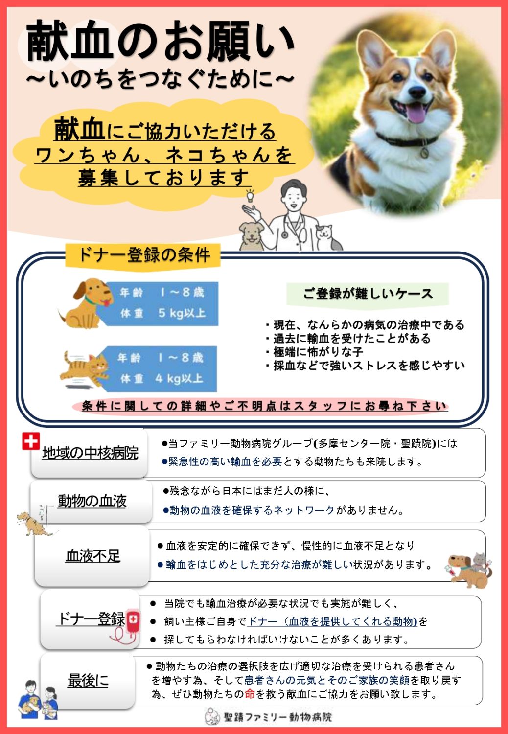 ※現在なんらかの病気の治療中、過去に輸血を受けたことがある、極端に怖がりな子など登録が難しい場合もあります。